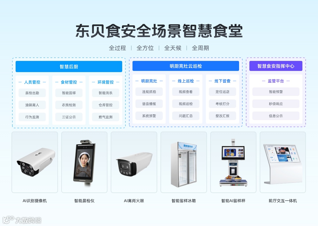 在团餐食安信息化管理方面,东贝智慧食安解决方案通过AI智能监控、物联网智能感知、大数据分析等技术,实现从食材入库到处理制作,再到成品的全过程覆盖,推动食堂“人、机、料、法、环”的全方面监管,构建“食材全链安全流转、风险预警智能研判、监管力量智能调度、问题闭环及时有效”的校园食安风险智治体系。