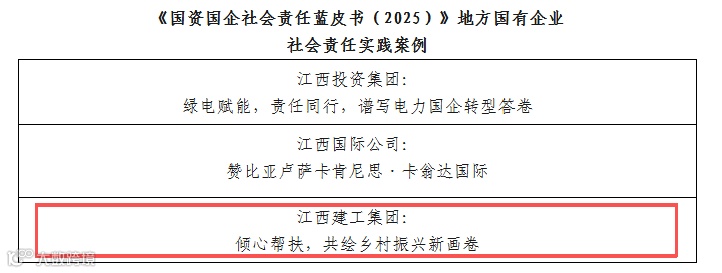 12月5日,国务院国资委社会责任局在京举办中央企业和地方国资国企社会责任蓝皮书发布会,以“勇担新使命、践行新担当”为主题,集中发布中央企业和地方国资国企社会责任系列蓝皮书。江西建工集团报送的“倾心帮扶,共绘乡村振兴新画卷”社会责任案例入选地方国有企业社会责任实践案例。