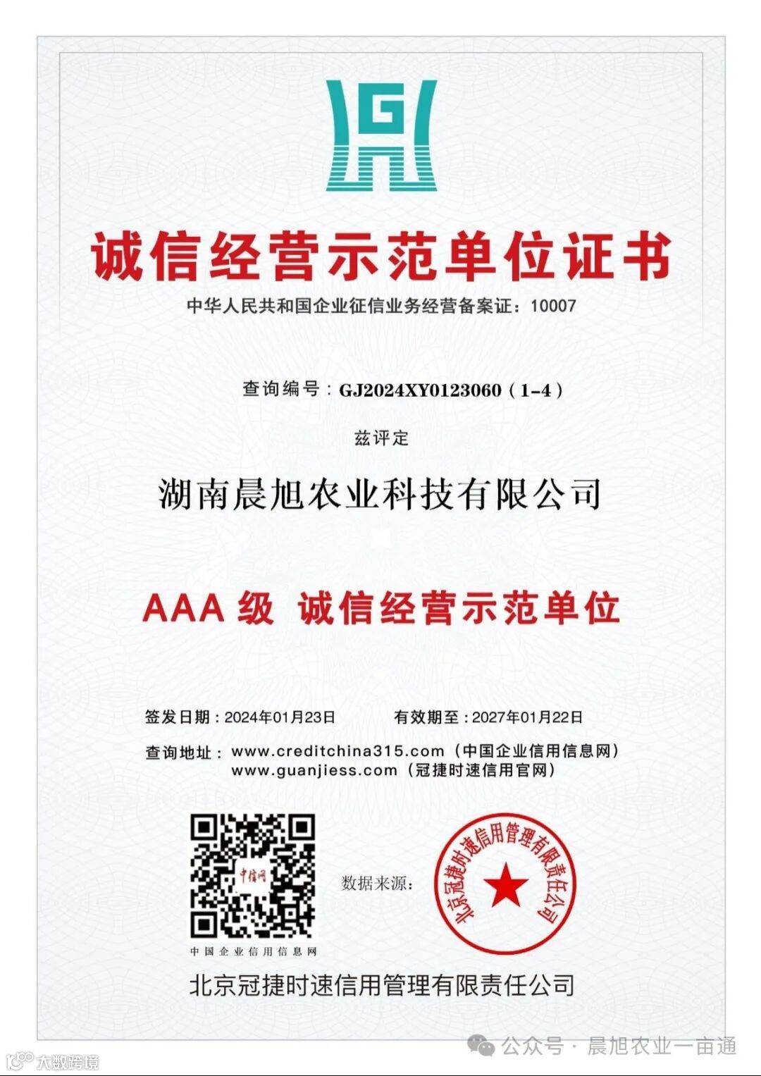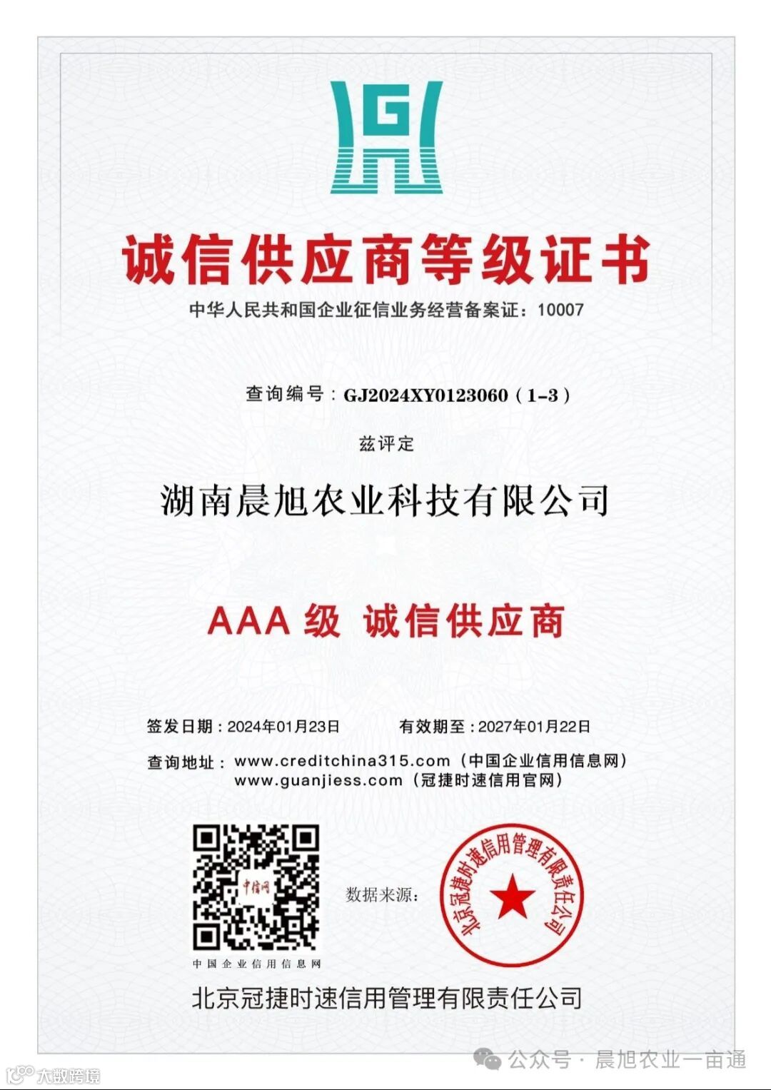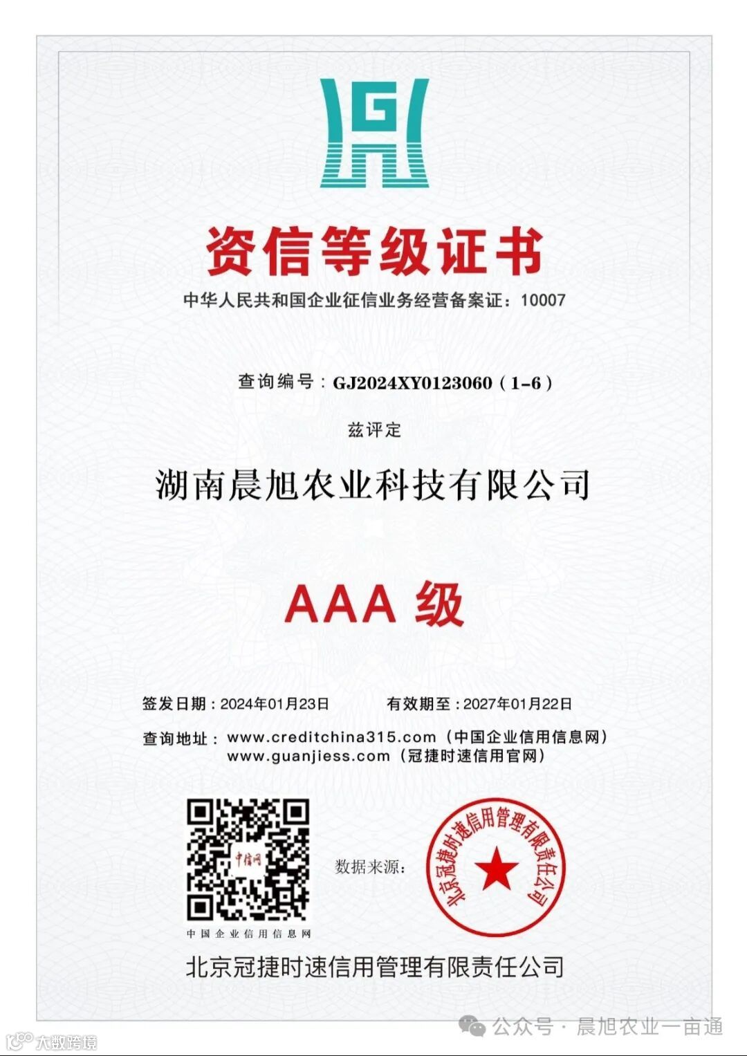 在竞争激烈的市场环境中,诚信是企业的生命线,是立业之本。今天,我们满怀激动和自豪的心情,热烈庆祝湖南晨旭农业科技有限公司荣获AAA信用等级认证!