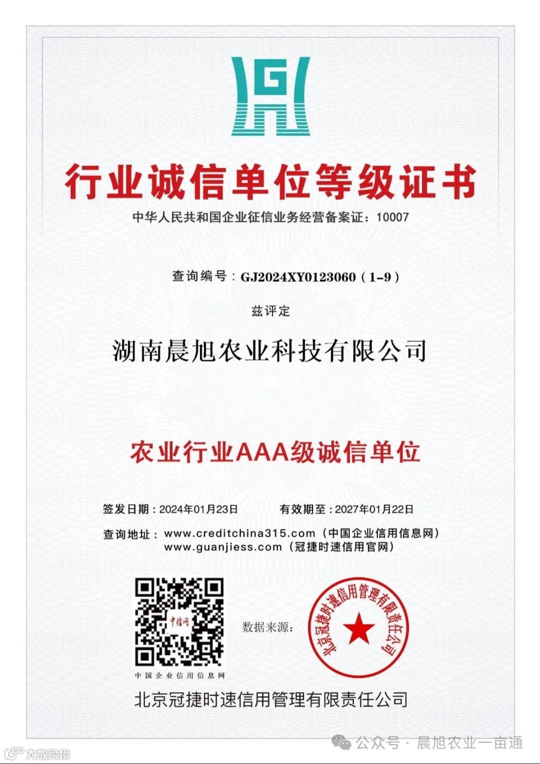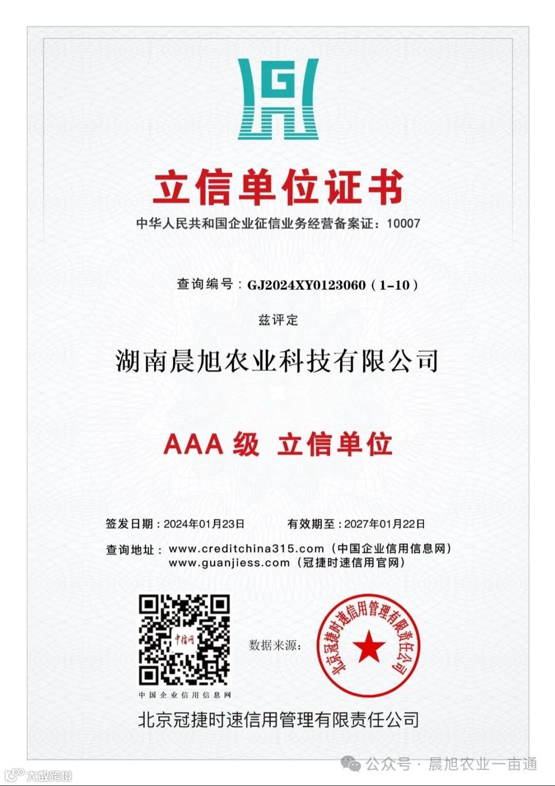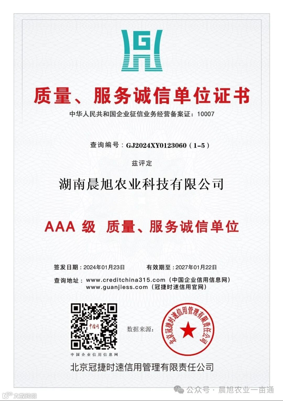 在竞争激烈的市场环境中,诚信是企业的生命线,是立业之本。今天,我们满怀激动和自豪的心情,热烈庆祝湖南晨旭农业科技有限公司荣获AAA信用等级认证!