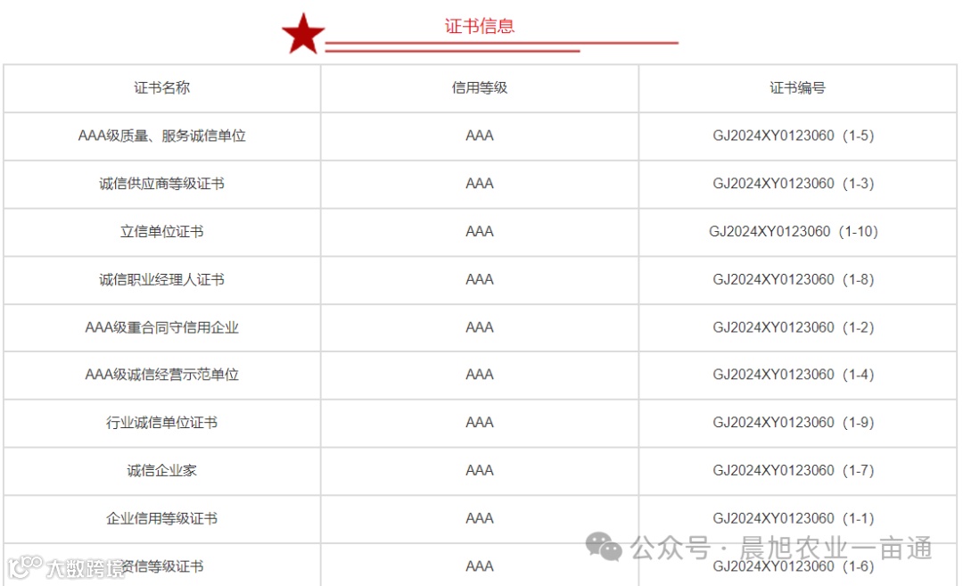 AAA信用等级认证的获得,意味着湖南晨旭农业科技有限公司在经营发展、财务状况、信用记录等方面表现优异。