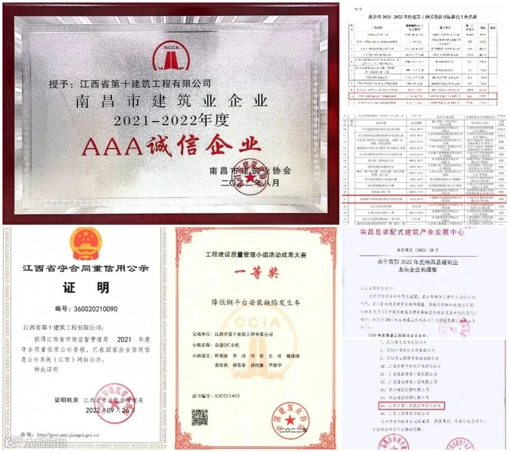 硕果累累承荣誉,这一年江西十建获得社会各界的认可和肯定,各项荣誉纷至沓来,先后斩获《2021年度省优质建设工程奖》、《2022年度南昌县建筑业龙头企业》、《2021-2022年度萍乡市建筑工程质量管理标准化工程》、《南昌市建筑业2021-2022年度AAA诚信企业》、《江西省2021年度守合同重信用企业》、《2022年度工程建设质量管理小组活动成果大赛一等奖》、《2022年萍乡市建筑安全生产标准化示范工地》、《2022年度南昌市建筑业龙头企业》等多项殊荣。