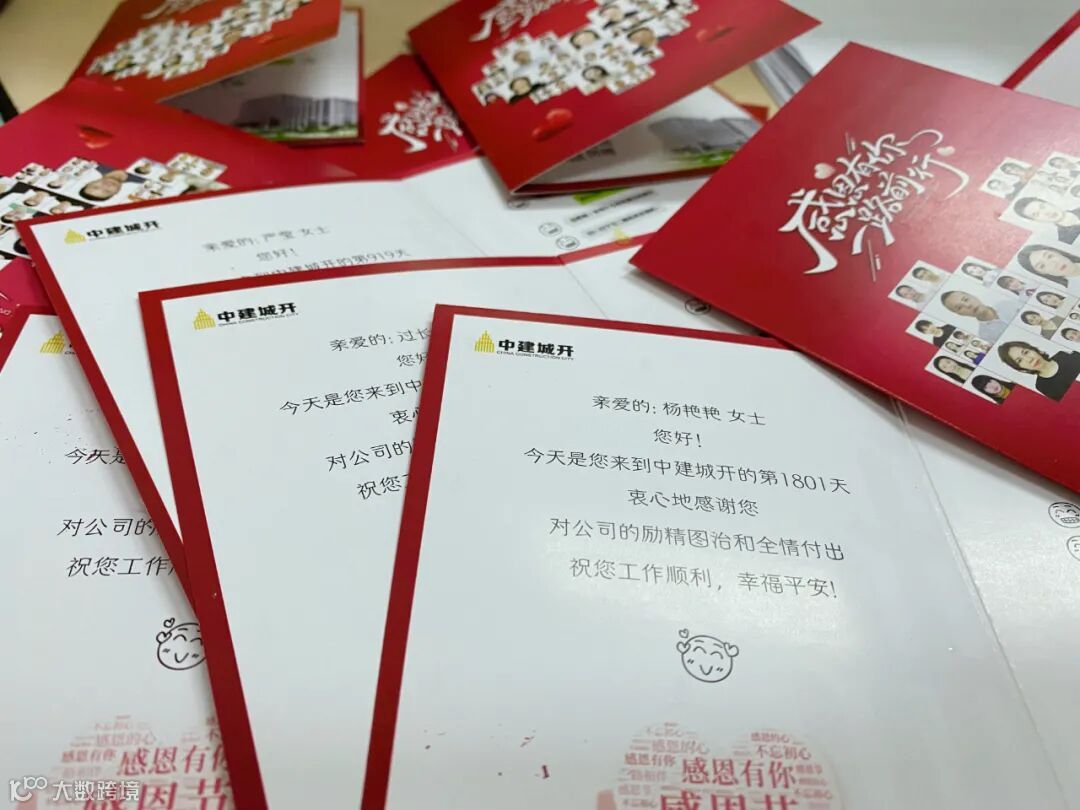 今天是感恩节,公司精心为每一位员工准备了感恩节贺卡,为大家送上一份祝福。世界辽阔,岁月长流;心怀感恩,所遇皆温柔。公司自成立以来,风雨兼程,能取得今天的成绩,离不开所有中建人的努力和付出,离不开所有客户的信任与支持,感谢你们坚定不移的选择!未来,请继续用你的青春和激情与中建城开一起续写华丽的篇章!