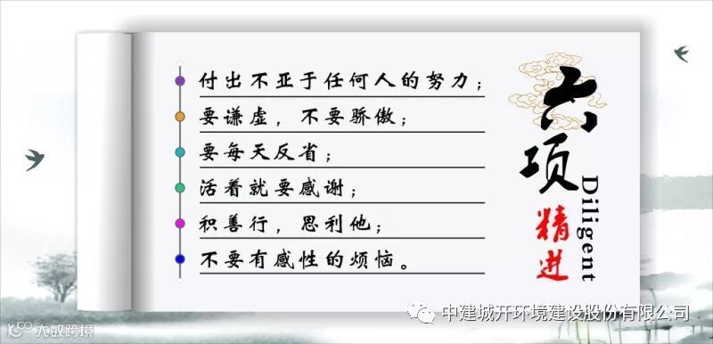 “六项精进”高度浓缩了稻盛和夫先生经营企业的哲学理念,对我们每个人的工作和生活都有着极强的指导意义。中建城开环境建设股份有限公司将“六项精进”作为企业文化的重要组成部分,并制定了《六项精进推行方案》。