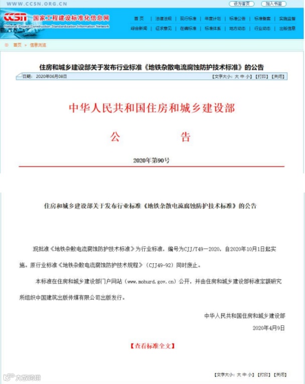 近日,住房和城乡建设部发布了关于行业标准《地铁杂散电流腐蚀防护技术标准》(CJJ/T49—2020)的公告,该标准于2020年10月1日生效。该标准由中建城开环境建设有限公司与北京市地铁运营有限公司共同主编。