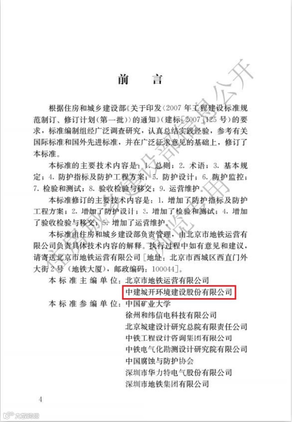 《地铁杂散电流腐蚀防护技术标准》的发布实施,标志着中建城开在技术领先和创新水平上再上新台阶,为推动行业技术进步、助推企业可持续发展奠定了坚实的基础。