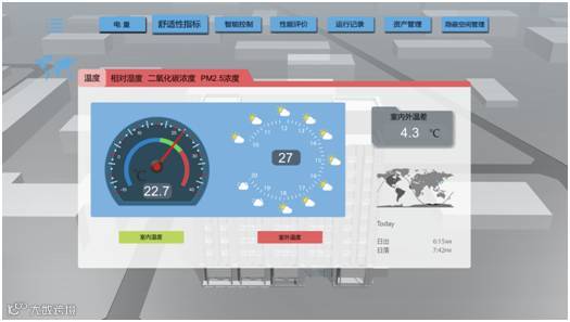 通过该平台,可以进行室内舒适度指标的监测和显示,并通过室内运行参数进行系统的节能运行。通过三维模型可以精确显示各个房间室内环境参数,通过房间的运行参数,就可以知道建筑内各个房间的舒适度情况,明确建筑的节能空间。以温度显示为例,其显示界面如图6所示。