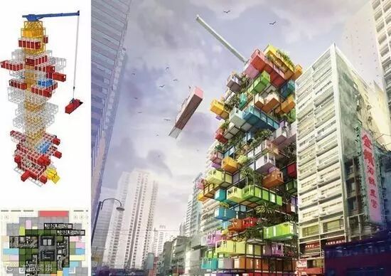 设计师团队考虑到香港有限的居住条件和可持续发展,大胆地预测了一种在未来可能非常常见的居住模式——更多的申请者将更加需要诸如紧急性住房和医疗保障单元房。因此,这些集装箱单元房可以被随时拆卸组装到任何地方,并且可以承担办公、出租房或公司的临时办公区等不同的功能。