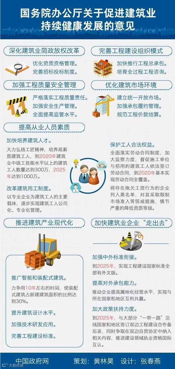 建 筑业是国民经济的支柱产业。改革开放以来,我国建筑业快速发展,建造能力不断增强,产业规模不断扩大,吸纳了大量农村转移劳动力,带动了大量关联产业,对 经济社会发展、城乡建设和民生改善作出了重要贡献。但也要看到,建筑业仍然大而不强,监管体制机制不健全、工程建设组织方式落后、建筑设计水平有待提高、 质量安全事故时有发生、市场违法违规行为较多、企业核心竞争力不强、工人技能素质偏低等问题较为突出。为贯彻落实《中共中央 国务院关于进一步加强城市规划建设管理工作的若干意见》,进一步深化建筑业“放管服”改革,加快产业升级,促进建筑业持续健康发展,为新型城镇化提供支 撑,经国务院同意,现提出以下意见: