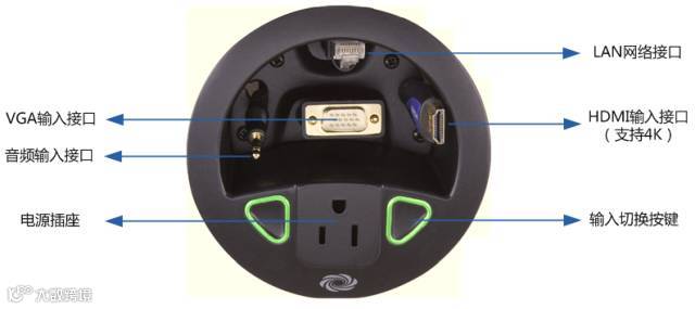 TT-100在接口配置方面,包含1个HDMI,1个VGA视频输入接口,同时配备一个3.5音频输入接口,以方便电脑或其他设备音频输入,桌面连接器还配有强电插座方便设备电源接插,同时还配有一个以太网络线缆接入网络。麻雀虽小,五脏俱全,如此小巧却不失大方的桌面连接器,却包含了企业办公所能用到的全部演示接口。