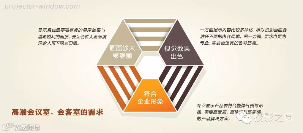 商业企业或公司的高端会议室,用于接待重要宾客,需要配备专业大屏幕显示设备,用于介绍及展示等。很多会议室采光非常好,比如采用落地玻璃,而且环境空间比较大,因此,用户对显示系统的主要要求为如下三个方面: