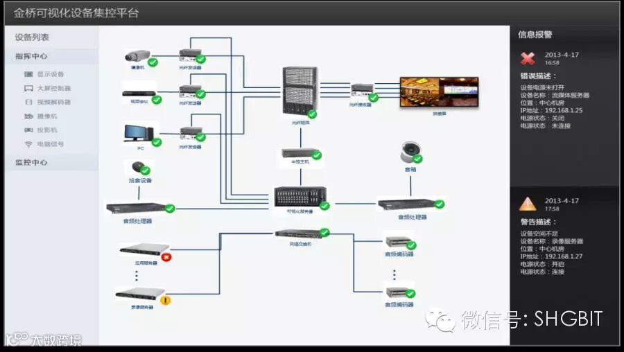 对于像网络交换机,服务器之类的设备,人们可以通过网管系统,进行直观,可视化的设备管理,但AV设备诸如投影机,矩阵等设备,虽然普遍使用于各种会场,指挥中心等场所,但却没有一个可视化管理的直观管理平台。金桥公司就针对如何像网管系统一样,直观管理大量AV等设备这个问题,研发了GBMONITOR金桥可视化设备集中管理平台。整个平台采用SNMP标准网管协议,与各AV系统相关设备进行连接,可提供统一的设备拓扑发现与动态更新,实现全网集中监测,实时监视网内所有设备及线路的运行状态。并对不支持SNMP协议的设备提供两种协议转换器,一种为查看协议转换器,一种为监控协议转换器。整个平台具有设备管理、可视化监控、预警报警等功能。