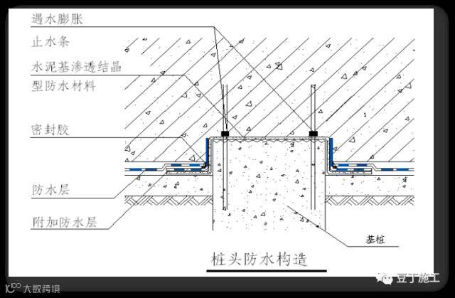 桩身与基层交接处,用密封膏密封,卷材附加防水层,上翻至桩身40mm处,然后大面铺贴防水卷材。