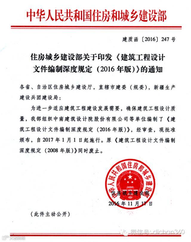 2016年•施工图设计深度标准 住建部-建质函【2016】247号文通知:《工程设计深度规定(2016年版)》自2017年1月1日起实施,原《设计深度规定(2008年版)》同时废止,今天就把新版文件分享给大家▼