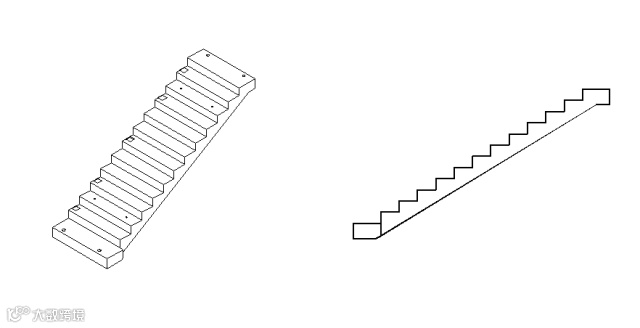 这种预制楼梯为目前应用最多的产品,但是由于没有统一的设计图集,在上述楼梯结构基础上还有很多变种出现,如将楼梯和平台板同时预制;或平台板部分预留钢筋,施工时将钢筋和平台板同时浇筑成型等。