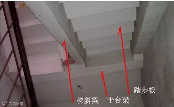 梁式楼梯由梯斜梁和踏步板组成。一般在踏步板两端各设一根梯斜梁,踏步板支撑在梯斜梁上。梯斜梁支撑在楼梯两端的平台梁上。平台梁和梯斜梁为现场浇筑而成,踏步板为完全预制。