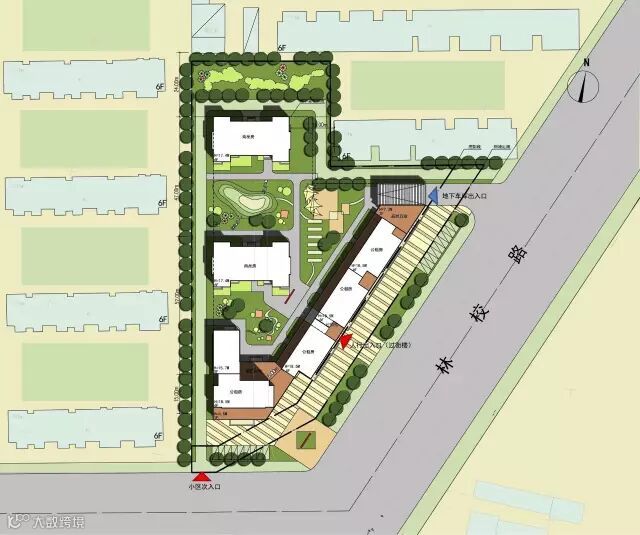 小区采用围合型的布局结构,外向对城市开放商业设施,树立良好的城市形象,内向营造一个安全、宁静的高品质的居住空间。为强调近人尺度,公租房和商品住宅均为6层,设置住宅底层局部架空、过街楼和入户大堂等,创造宜人的居住环境和氛围。