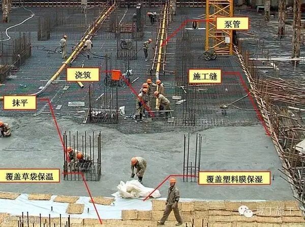 6、大体积泵送混凝土经振捣后表面水泥浆较厚,容易引起表面裂缝。首先,要求在振捣最上一层混凝土时,控制振捣时间,注意避免表层产生太厚的浮浆层;在浇捣后,必须及时用2m 长括尺,将多余浮浆层刮除,按照标高控制点,将混凝土表面括拍平整。有凹坑的部位必须用混凝土填平,在混凝土收浆接近初凝时,混凝土面进行二次抹光,用木蟹全面仔细打抹两遍,既要确保混凝土的平整度,又要把其初期表面的收缩脱水细缝闭合,在混凝土收浆凝固施工期间,除了具体施工人员外,不得在未干硬的混凝土面上随意行走,收浆工作完成的面必须同步及时覆盖薄膜。