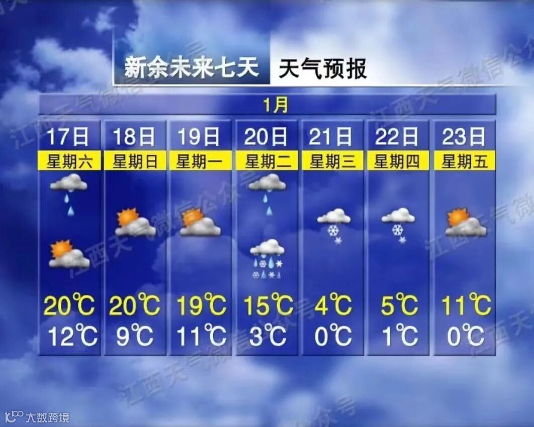 新余市气象台2026年1月19日7时20分发布寒潮蓝色预警信号:预计未来48小时内,分宜县、渝水区、仙女湖区、高新区的平均气温将下降12~14℃,最低气温降至0℃以下,江湖水面、平原河谷和高海拔山区阵风可达7~8级,请注意防范。(预警信息来源:国家预警信息发布中心)