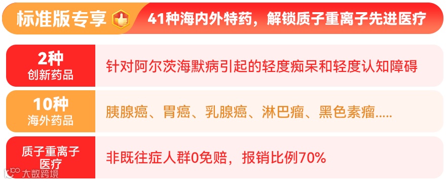 标准版在此基础上,增加了2种针对阿尔茨海默病的创新药品、10种海外药品,进一步满足重疾患者对前沿治疗药物的迫切需求!此外,标准版还将国际公认的抗癌利器——质子重离子纳入保障,给恶性肿瘤患者提供更好的治疗选择!