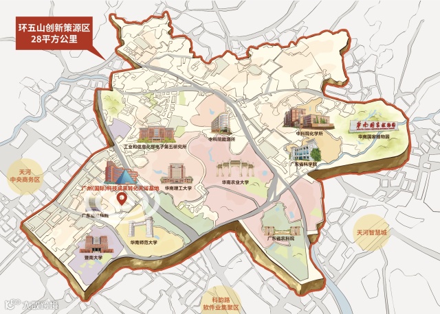 2022年,广州市政府工作报告首次提出“环五山创新策源区”的概念,对北至华南国家植物园、南至黄埔大道西,西至白云山、东至科韵路这一占地约28平方公里的区域赋予了重要使命。