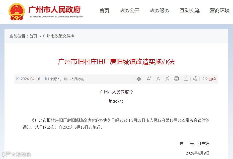 近年来,广州市把以“三旧”改造为核心的城市更新作为推动城市发展的重要抓手,在优化产业结构、改善人居环境、统筹城乡发展、完善城市功能、传承历史文化等方面取得显著成效。为了解决“三旧”改造项目的政策断档问题,保障既有“三旧”改造项目顺利推进、落地实施,我市结合“三旧”改造工作实际,制定《广州市旧村庄旧厂房旧城镇改造实施办法》(以下简称《实施办法》)。2024年4月16日,《实施办法》)在广州市政府网站公布,自2024年5月15日起施行。