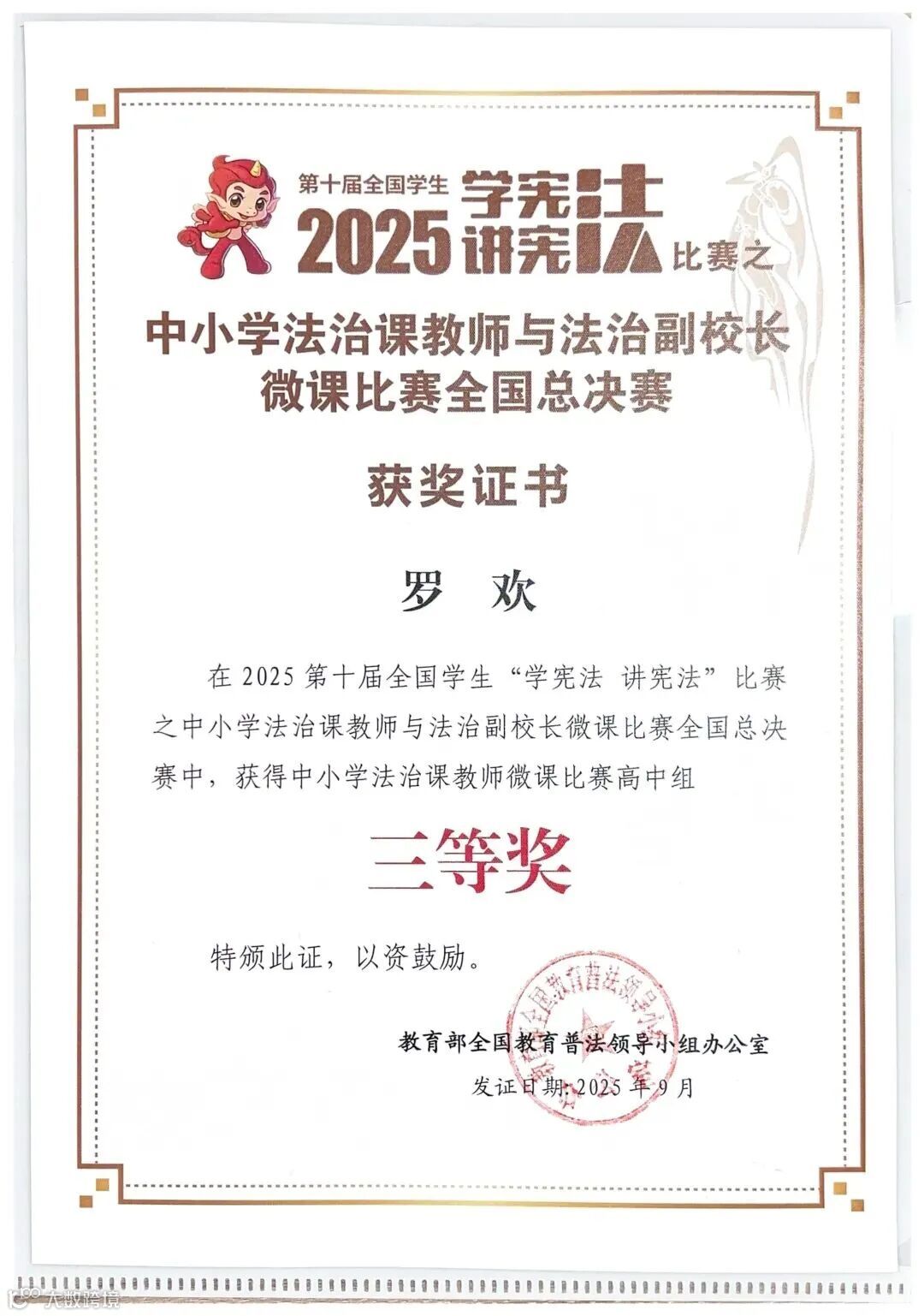 近日,第十届全国学生“学宪法 讲宪法”中小学法治课教师微课比赛全国总决赛落下帷幕,代表江西省参赛的渝水二中教师罗欢凭借精湛的教学设计与扎实的专业素养,荣获全国三等奖,为新余市赢得国家级奖项!