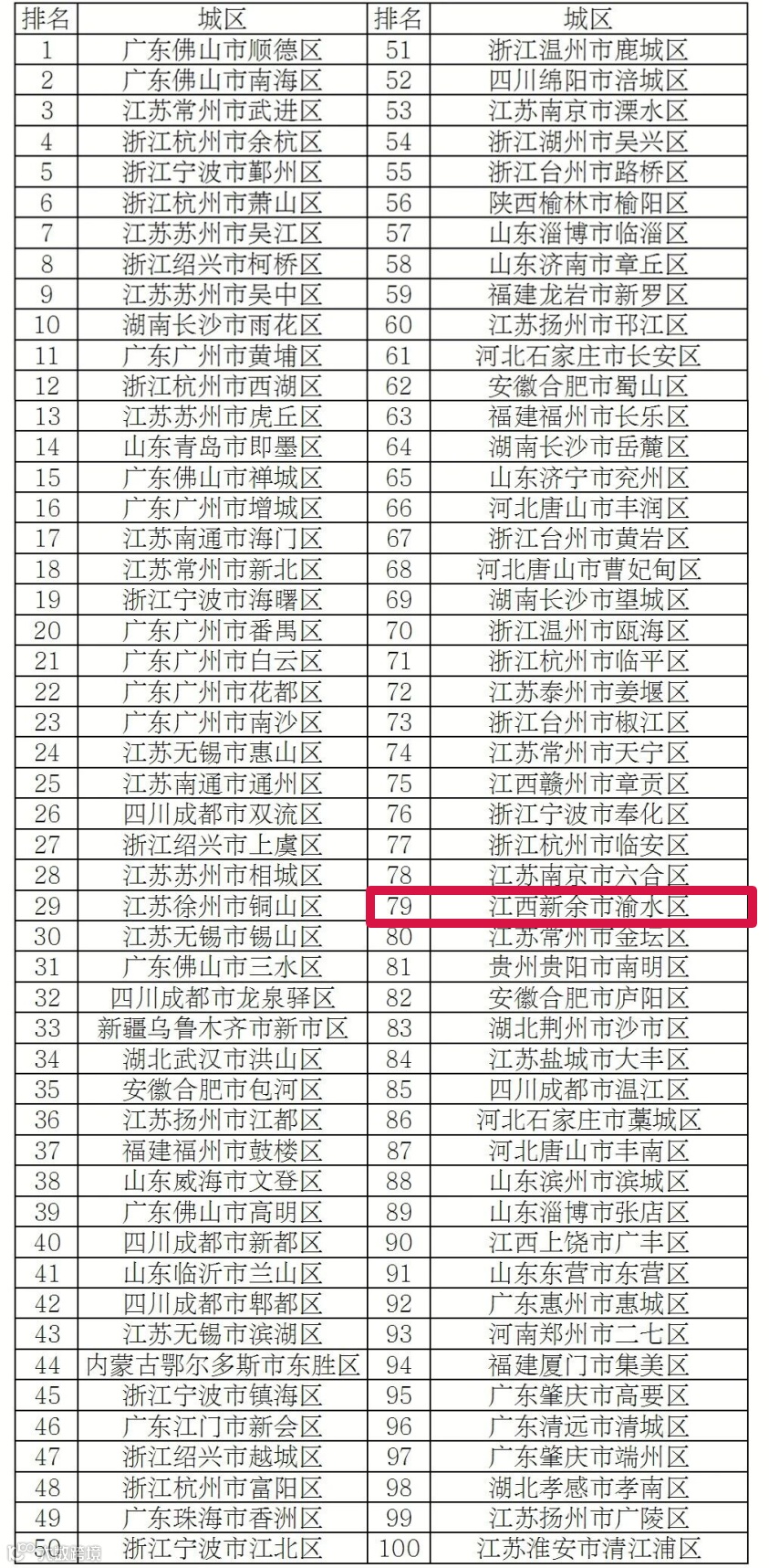 渝水区在2025年度全国综合实力百强区中排第79位