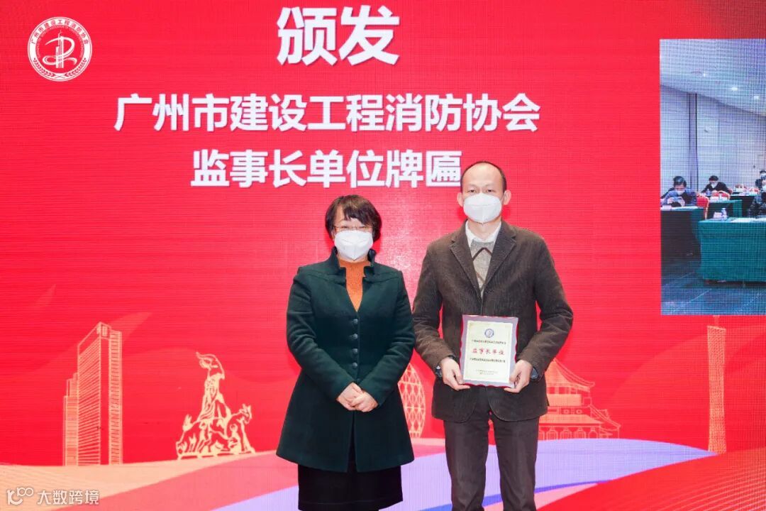 梁伟(右)代表我院领取广州市建设工程消防协会监事长单位聘书