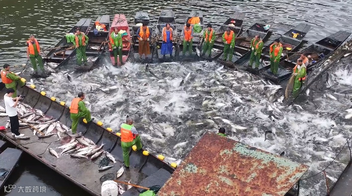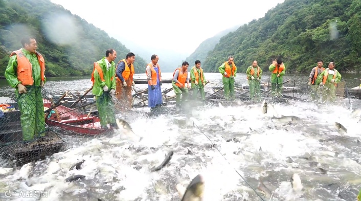 随着巨网不断收窄,网中鱼儿拍打着湖水,上下翻腾,溅起两米多高的水花,犹如一大锅煮开沸腾的“饺子”,场面十分壮观。