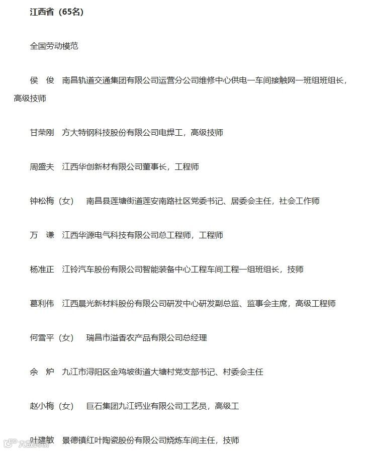 江西65人拟获全国劳动模范、