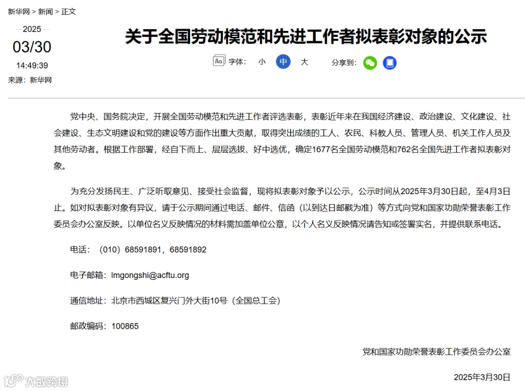 《关于全国劳动模范和先进工作者拟表彰对象的公示》