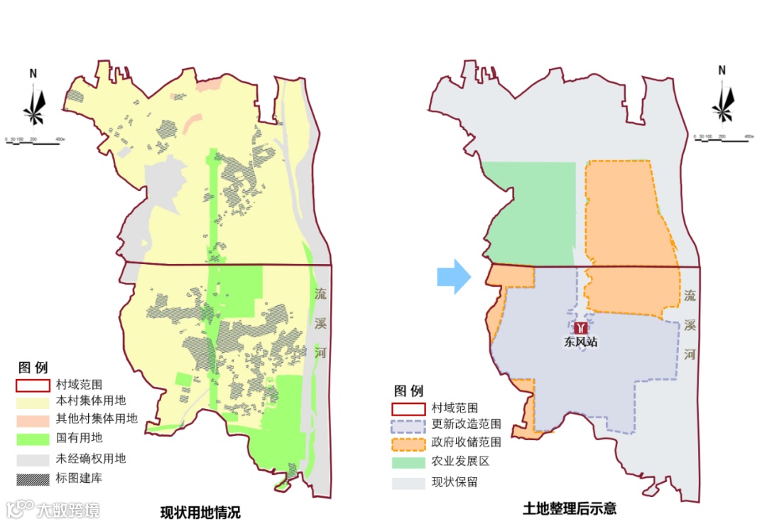 同时,发挥城市更新对于产业导入、引入合作企业、安置补偿、土地出让等方面的政策优势,鼓励社会资本参与项目实施,解决土地整合的资金来源、后续运营等问题。例如:从化东风村地处从化集中建成区边缘,建设用地与农用地交错分布,成规模的建设用地集中在村域南侧,拟通过储改结合、拆旧复垦、预支留用地、划定“三地”等方式整理村域范围内土地。土地整理后,村域南侧为城市更新项目,进行集中建设;北侧为集中的农业生产空间、政府储备用地、生态保护项目。