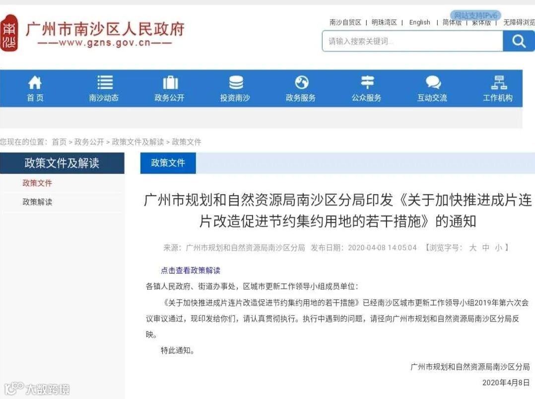 为加快推进南沙区成片连片更新改造,提升节约集约用地水平,推动南沙实现高质量发展,2020年4月8日,广州市南沙区正式发布《关于加快推进成片连片改造促进节约集约用地的若干措施》(以下简称《若干措施》)。