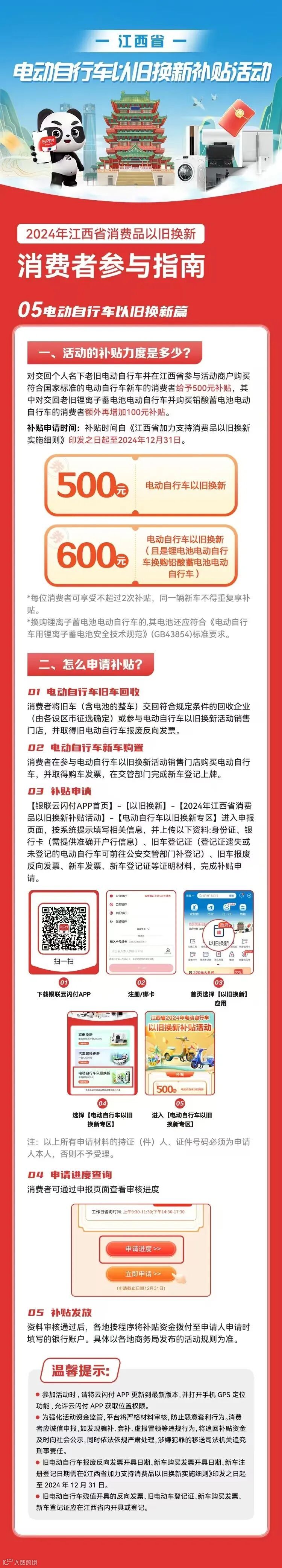 即日起至2024年12月31日,个人消费者交回其本人名下登记在江西的电动自行车旧车(含电池的整车),并在江西省购买电动自行车新车的将给予500元补贴,其中对交回老旧锂离子蓄电池电动自行车并购买铅酸蓄电池电动自行车的消费者额外再增加100元补贴。