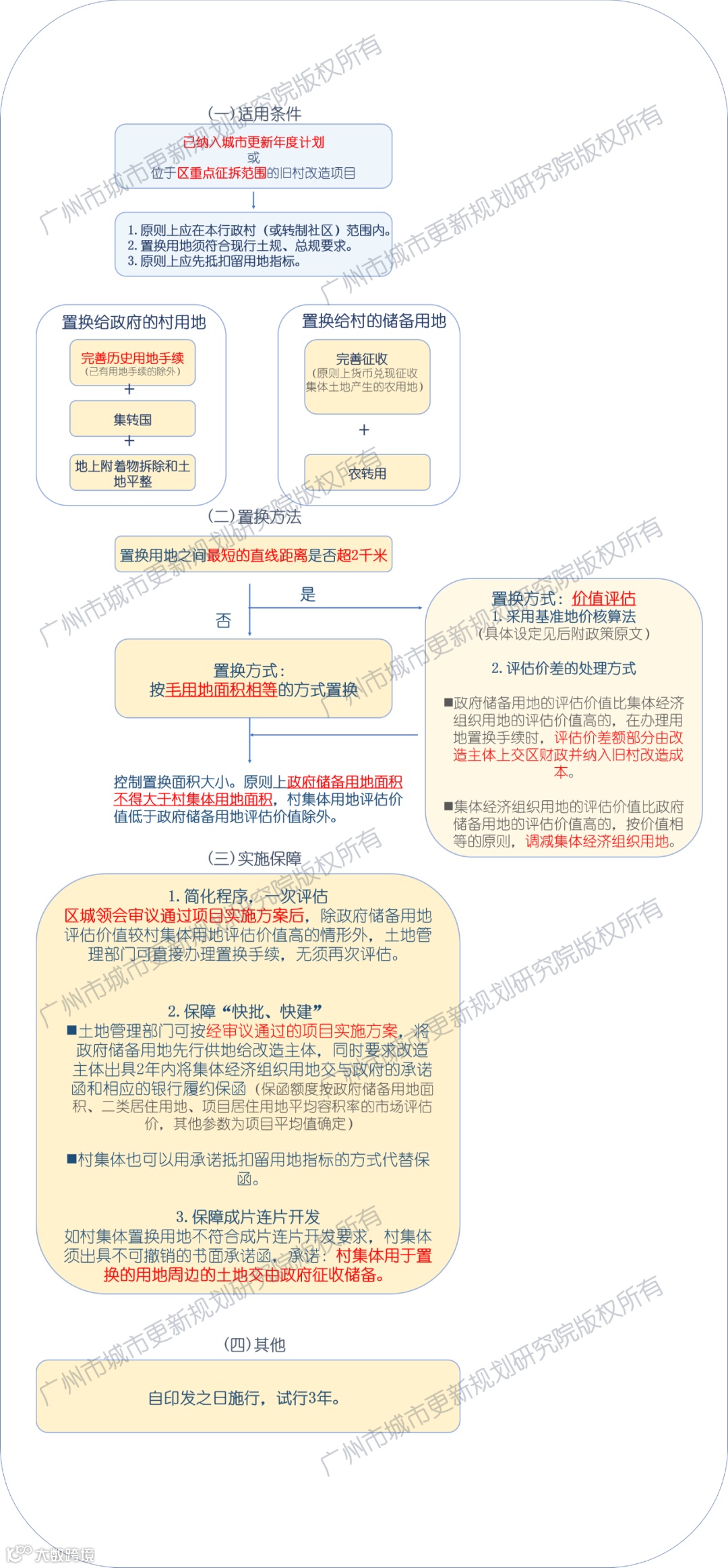 ●2019年,《广州市黄埔区 广州开发区加快省“三旧”改造改革创新试点工作若干措施》(穗埔府〔2019〕10号)提出“允许用地空间腾挪整合、土规规模及转用指标置换、留用地或预支留用地按政策纳入旧村改造。”