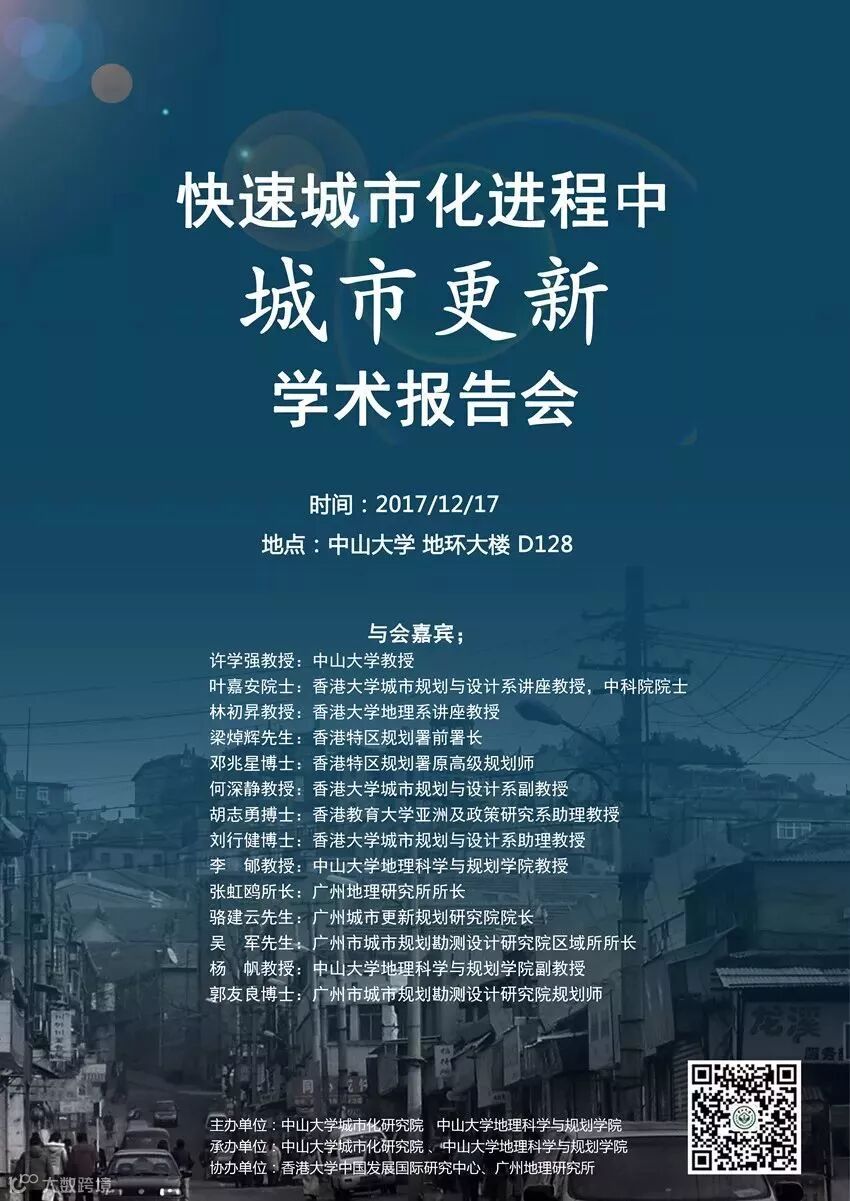 2017年12月17日,由中山大学城市化研究院、中山大学地理科学与规划学院主办,香港大学中国发展国际研究中心、广州地理研究所协办的“快速城市化进程中城市更新学术报告会”在中山大学地环大楼D128举行。