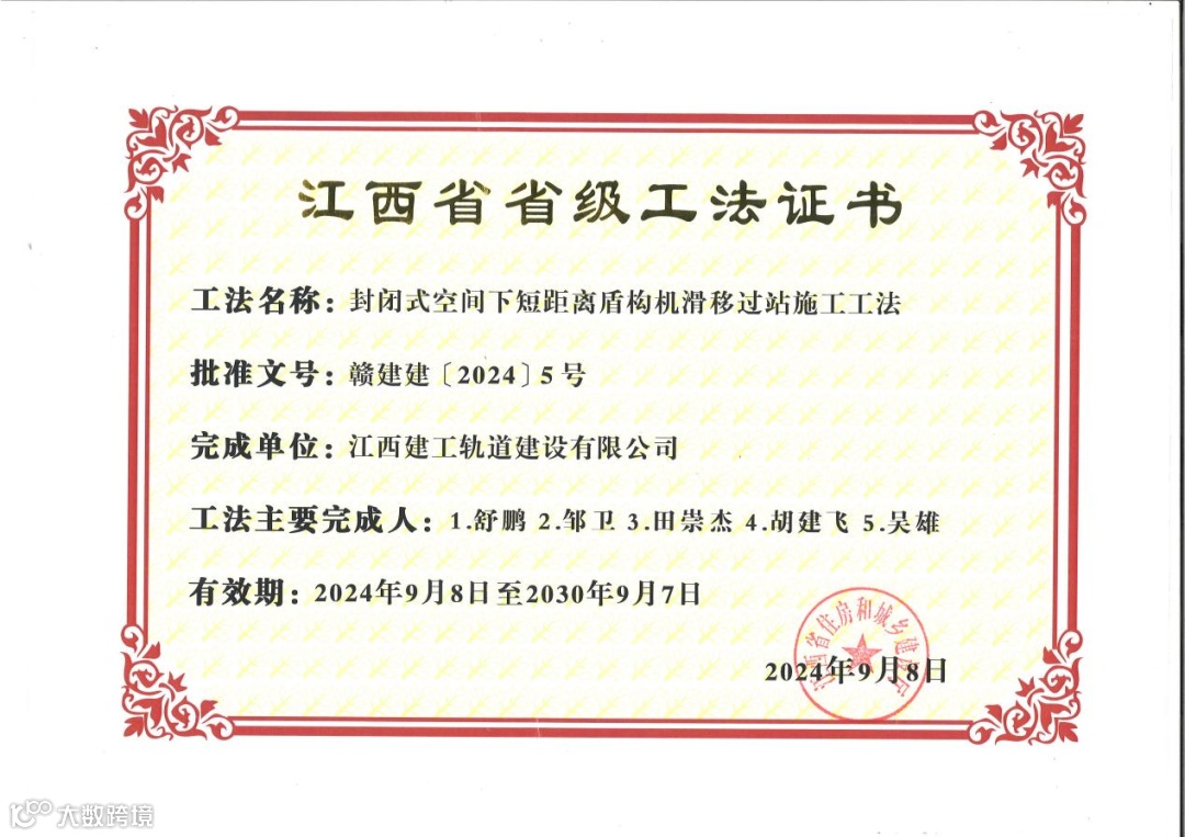近日,由江西建工轨道建设有限公司编写的《封闭式空间下短距离盾构机滑移过站施工工法》荣获江西省2024年度第一批省级工程建设工法,在公司技术部组织和指导下,再次获评地铁隧道施工领域省级工法,进一步提高公司地铁施工技术能力,为公司专业化、特色化发展赋能。