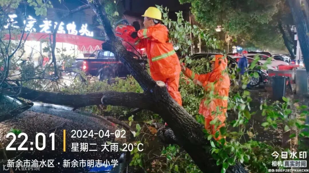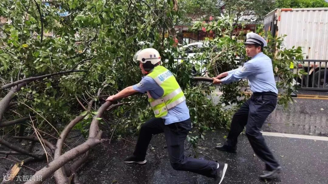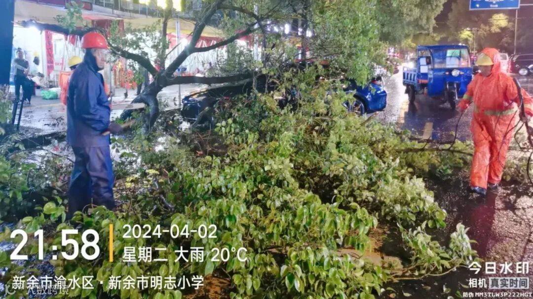 ▲渝水区站前东路旁一棵大树因强对流天气倒下,造成道路被堵,现场交警及时指挥疏导路面通行车辆绕行,与有关部门共同清理现场。