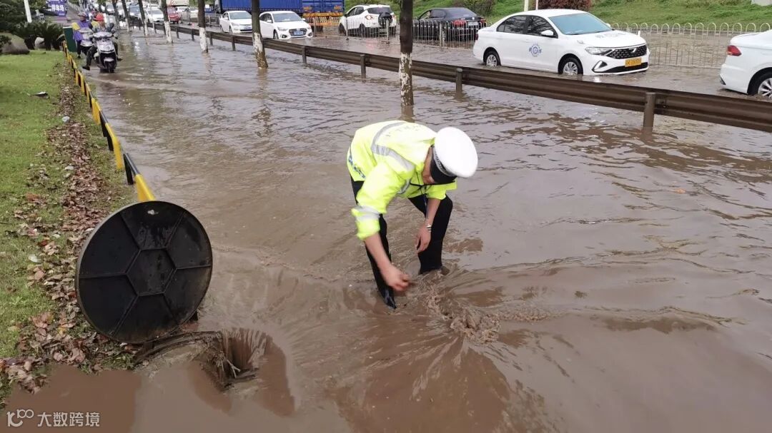 ▲市政工作人员对全市各城区易涝路段开展巡查,及时疏通检查井、清理积水,保障道路正常通行。