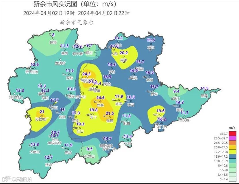 全市过去3小时平均雨量18.8毫米,以渝水区界水站39.4毫米为最大,渝水站35.1毫米次之。19个测站出现8级及以上阵风,1个测站出现10级阵风,以高新区马洪站10级(24.6米/秒)为最大,仙女湖区欧里站9级(24.3米/秒)次之。闪电次数970次。