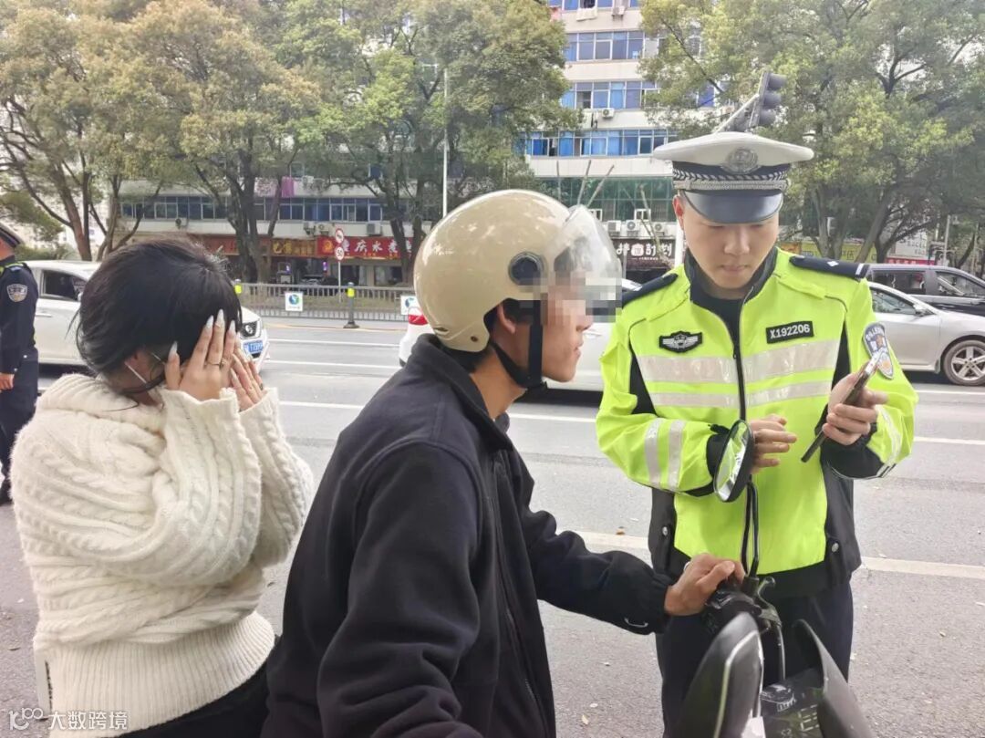 ▲交警城北大队执勤民警要求未佩戴安全头盔的摩托车、电动自行车驾乘人员观看学习交通安全教育视频。