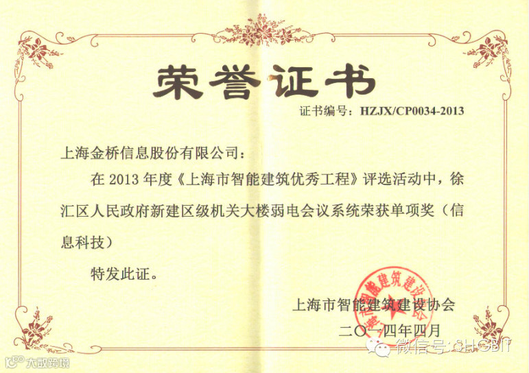 “上海市智能建筑建设协会第一届第四次会员大会”于2014年5月21日在上海大宁福朋喜来登大酒店隆重召开。大会总结了协会在2013年度开展的主要工作和取得的显著成果,揭晓并颁发了2013年度各大评选奖项。其中,上海金桥信息一举荣获“上海市智能建筑设计施工优秀企业”、“上海市智能建筑优秀工程”(申慧奖)、“优秀项目经理”三大奖项。