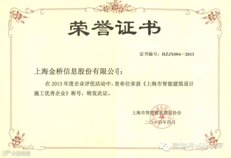 为推动上海市智能建筑建设行业健康、稳健、有序发展,提高企业综合实力和市场竞争力,提升本市从业企业整体形象,协会每两年开展一次“上海市智能建筑设计施工优秀企业”评优活动。评审由协会组织的专家小组对各企业近三年的荣誉资质、公司业绩、创新成果、典型项目、企业文化、人力资源等多项内容进行深度审查。上海金桥信息已经连续两次获此殊荣,充分证明了上海金桥拥有稳健的经营模式、开拓创新的发展理念和雄厚的企业综合实力。
