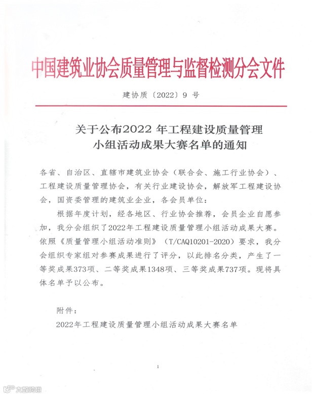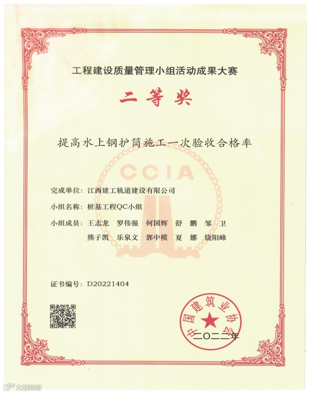 近日,中国建筑业协会传来喜讯,江西建工轨道建设有限公司桩基工程QC小组选送的《提高水上钢护筒施工一次验收合格率》课题,荣获中国建筑业协会工程建设质量管理小组活动成果大赛二等奖。