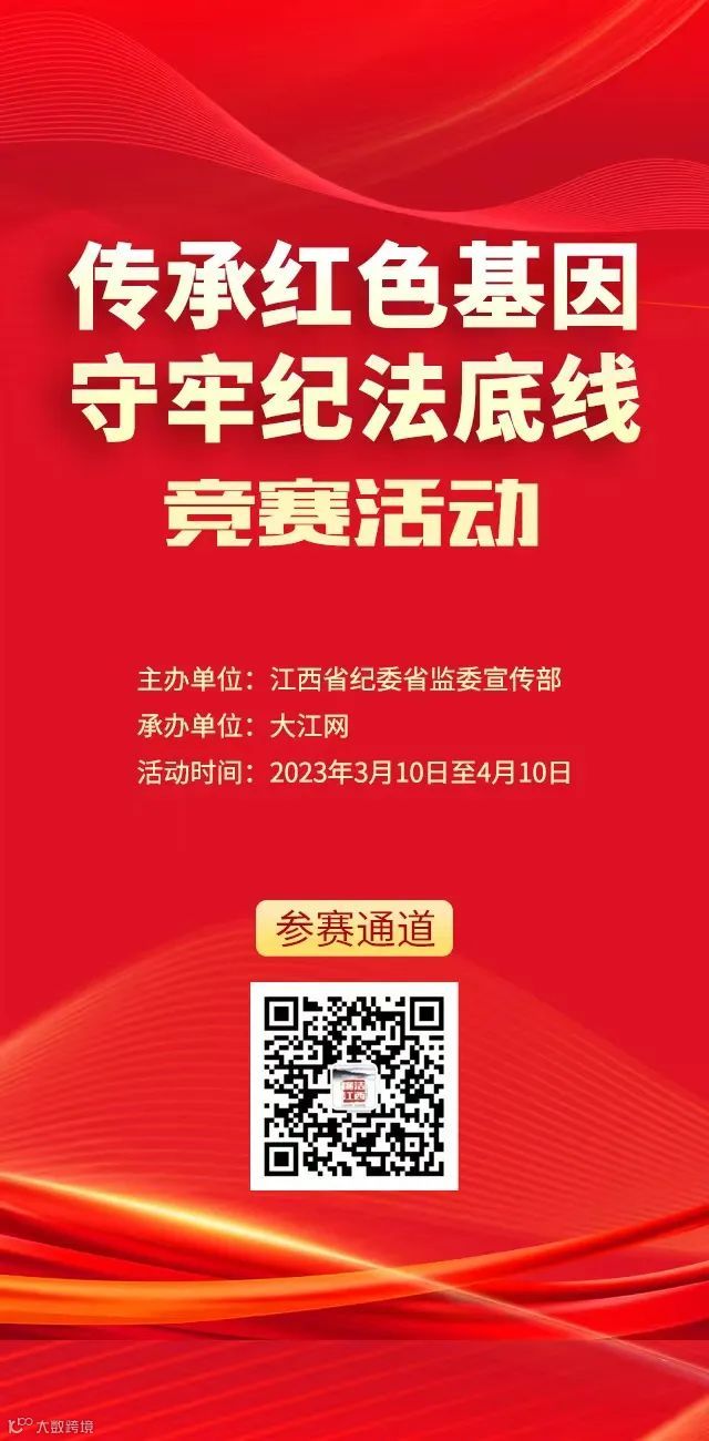 导读:3月10日至4月10日江西省纪委省监委宣传部联合大江网共同开展“传承红色基因 守牢纪法底线”竞赛活动加强革命
