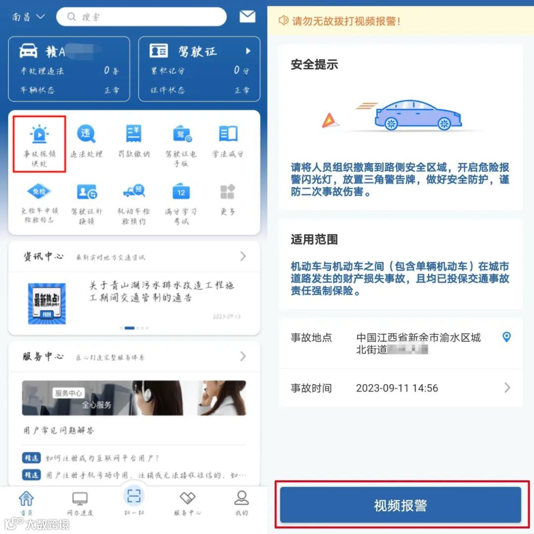 第一步,事故任意一方驾驶人在手机上打开“交管12123”APP,点击“事故视频快处”进入页面,点击下方的“视频报警”,即可与交警部门接警员进行视频连线,系统会自动定位事故地点信息。