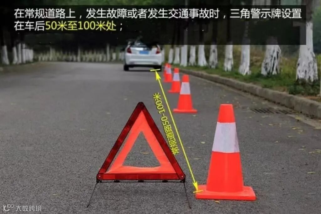 在车后50~100米处摆放三角警示牌