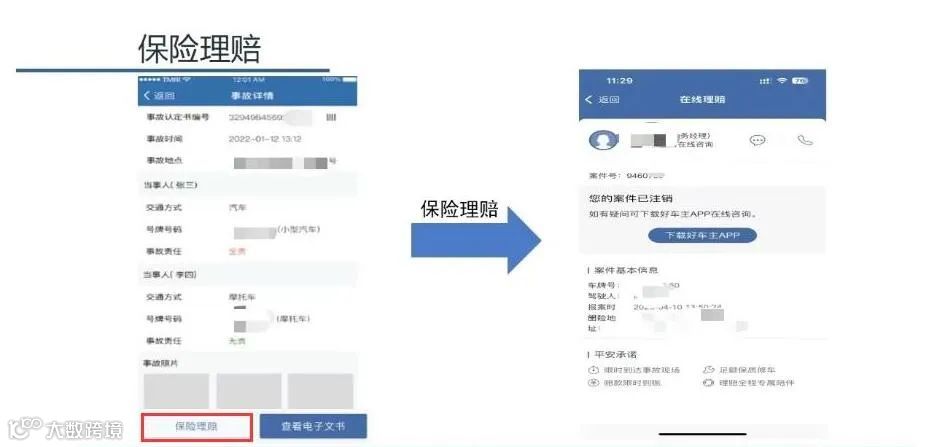 第五步,驾驶人可以凭【道路交通事故认定书(电子版)】直接联系保险公司理赔,也可在“交管12123”APP主页的【事故视频快处】中点击【我的事故】-【保险理赔】,线上联系保险公司理赔。