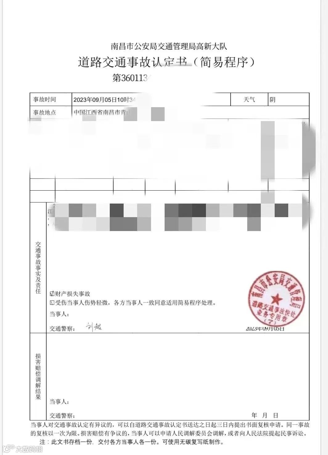 第四步,民警根据事故现场情况,通过公安交通管理综合应用平台完成事故责任认定,并将定责短信自动推送至事故驾驶人手机上。